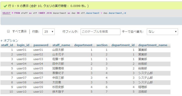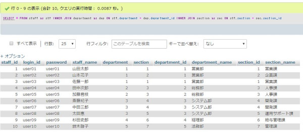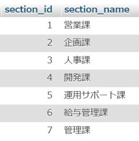 その他、staffテーブルの「department」はdepartmentテーブルの「department_id」、「section」はsectionテーブルの「section_id」と紐づきます。