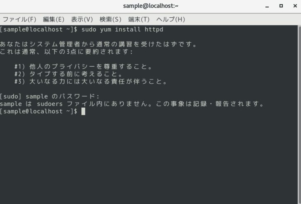 この操作をやらないでsudoコマンドを実行しようとすると、事象を管理者に報告されます、という警告がでます。