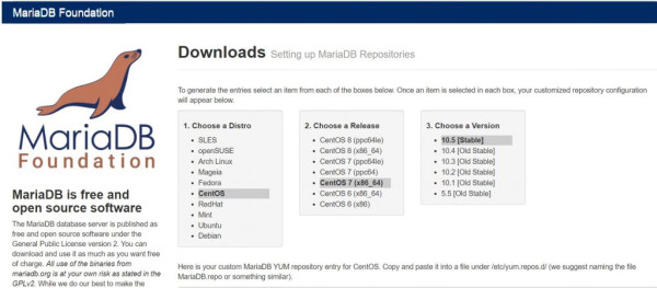 MariaDB Foundationから、CentOS7、入れたいバージョンを選びます。
