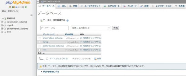 先ほどログインしたrootでログインしてみてください。成功するとデータベースのメニューが表示されます。