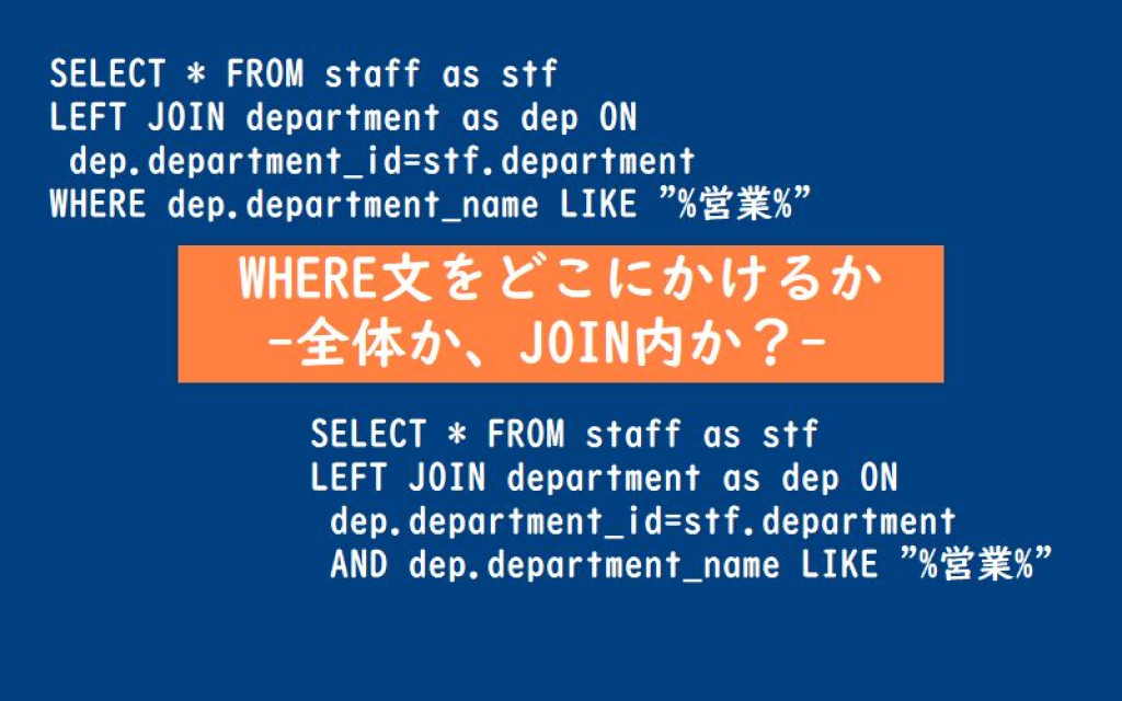 WHERE文を「どこにかけるか」によって取得できる結果が変わることがあります。