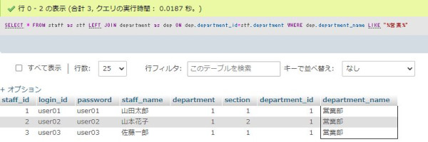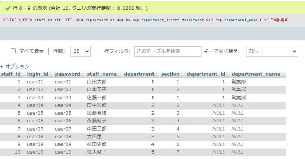 を表示しています。LEFT JOIN なので名前に「営業」を含まない行もNULLで出力されます(INNER JOIN であればこのNULL行は削除されます)。