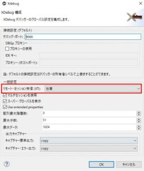 通常は「ローカルホスト」になっていますが、ここが「ローカルホスト」だとリモートデバッグができないので、必ず「任意」に変更します。